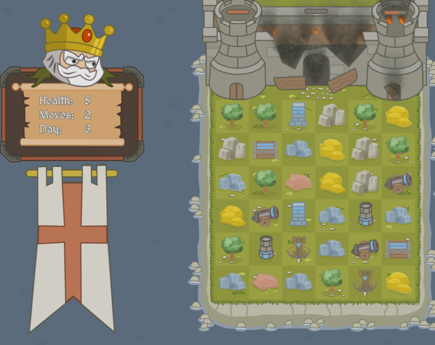Match three pieces of the same resource to upgrade them to a weapon or defence piece. When you have three of the same weapons, you can merge them to create more powerful units. Position your defenses so you can survive the attack. The castle has three sections and at least one section must survive to continue the game. Click on a chest to get a higher score or combine them to increase their value.